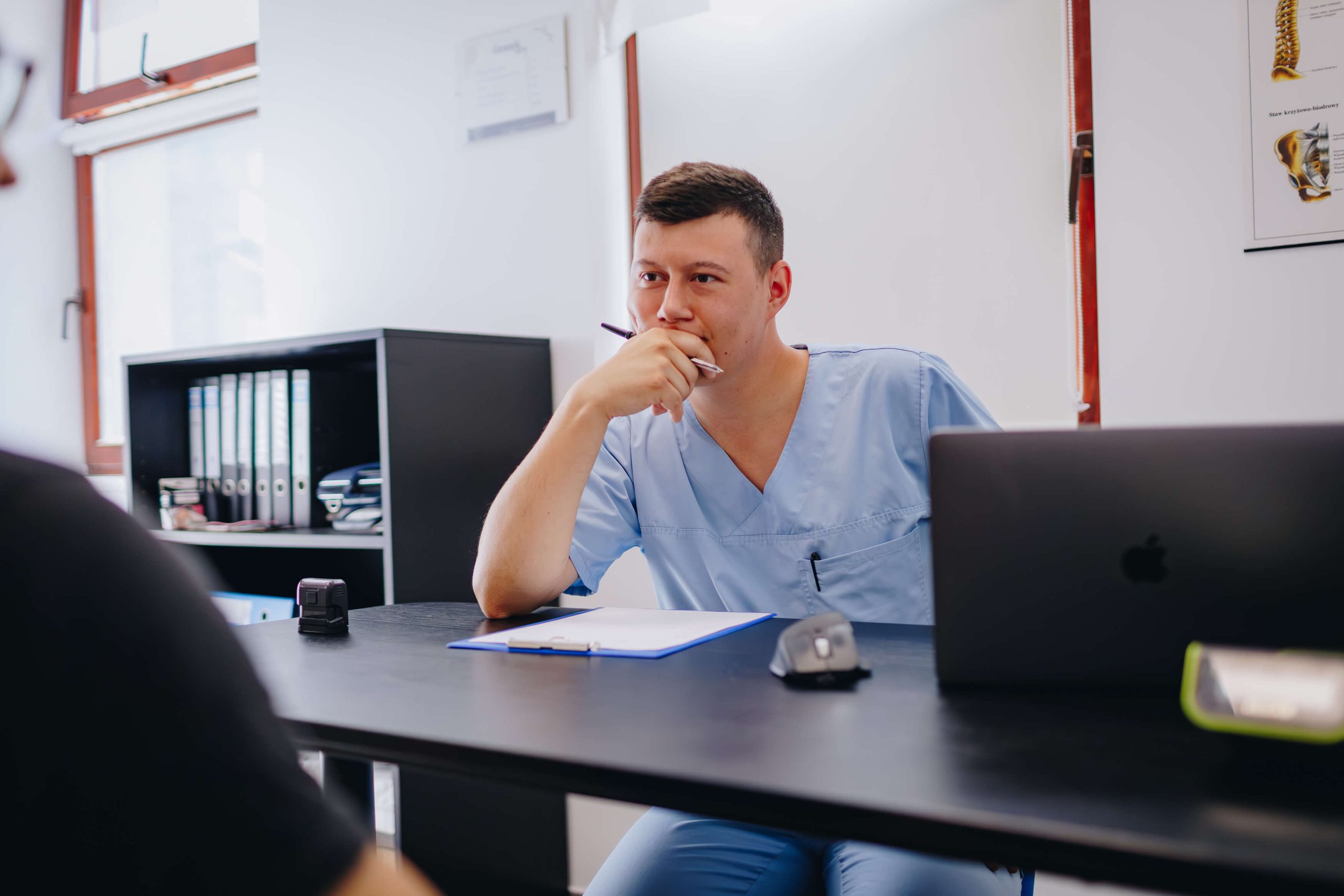 Po wywiadzie następuje badanie, które może przybierać różne formy – od testów ruchowych po pracę manualną. Celem jest ustalenie źródła problemu, które nie zawsze pokrywa się z miejscem bólu.